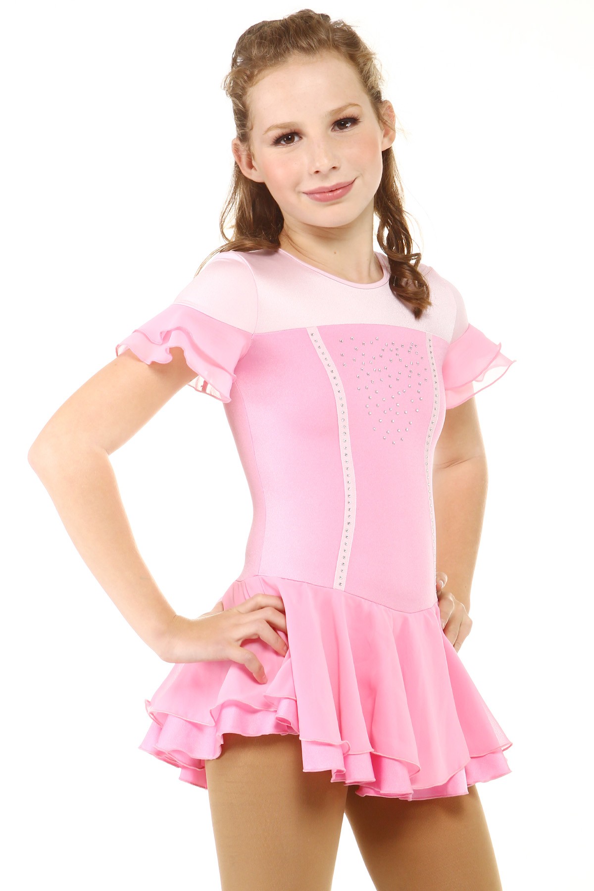 精湛的滑冰服经典的剪裁灵感的公主礼服。梦幻般的双层短袖和喇叭裙。水钻装饰的紧身胸衣提升的流体设计。