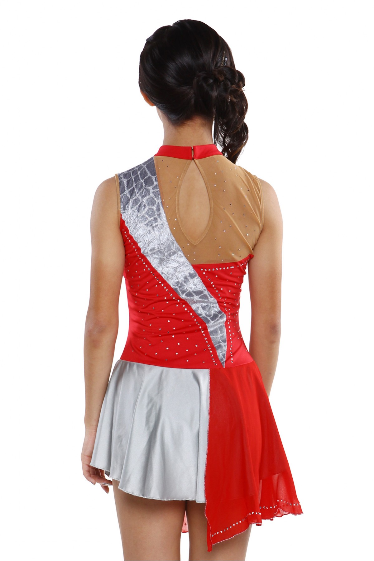 限量版,无袖的设计和大胆的中式变形银面料的上衣。水钻。红色网纱层布料的裙子也用水钻装饰额外的戏剧性。