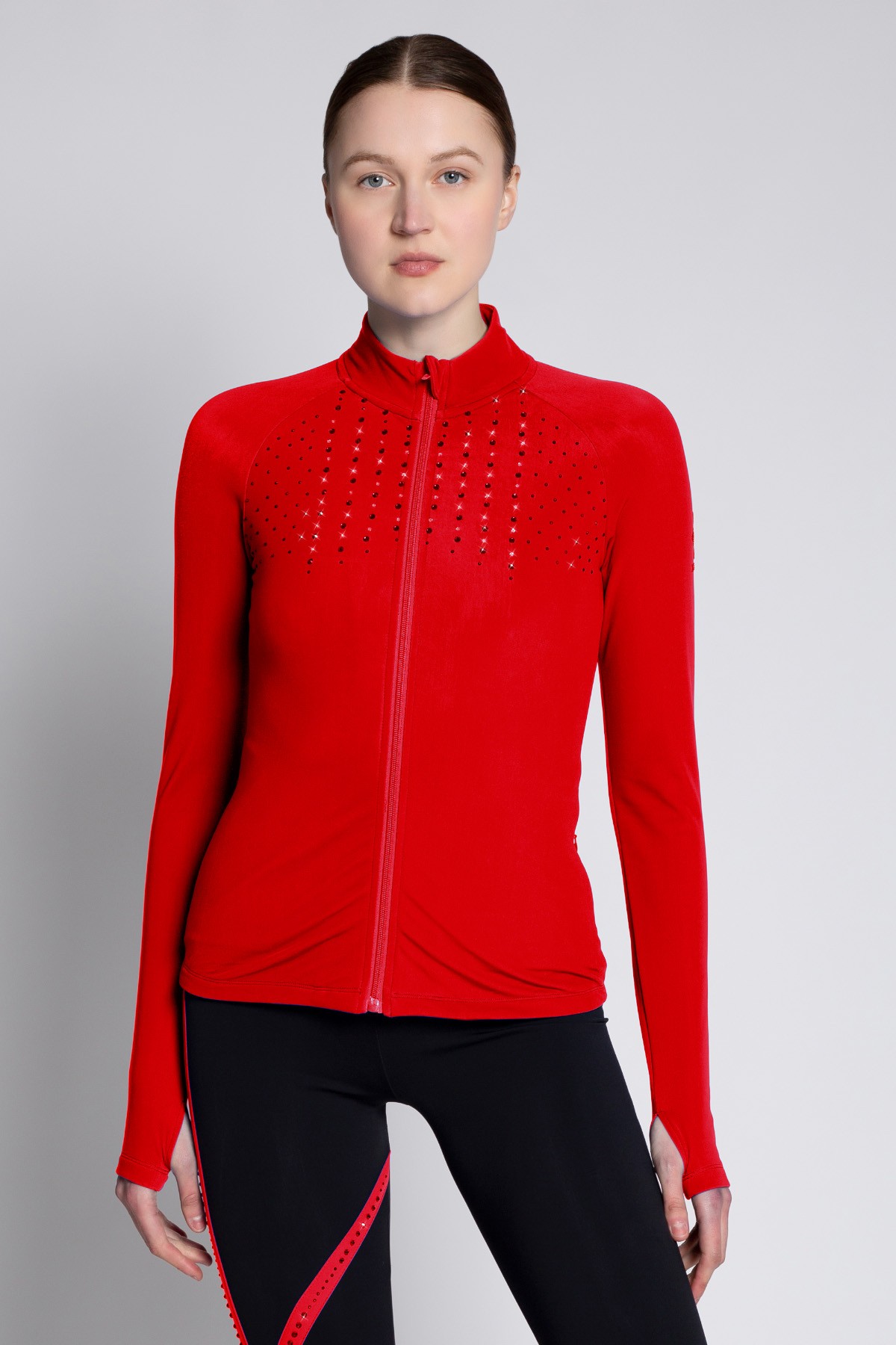 Elevate your performance with the Leslie Skater Jacket from XAMAS PREMIUM STAGE, a sustainable fusion of style and functionality. Adorned with rhinestones symbolizing wisdom, this jacket—crafted from premium Italian recycled fabric—features a form-fitting silhouette with a new low collar cut for maximum movement. Perfect for warm-ups with its high retention and fast-dry technology, it pairs beautifully with our Leslie Over-the-Heel Skating Pants.